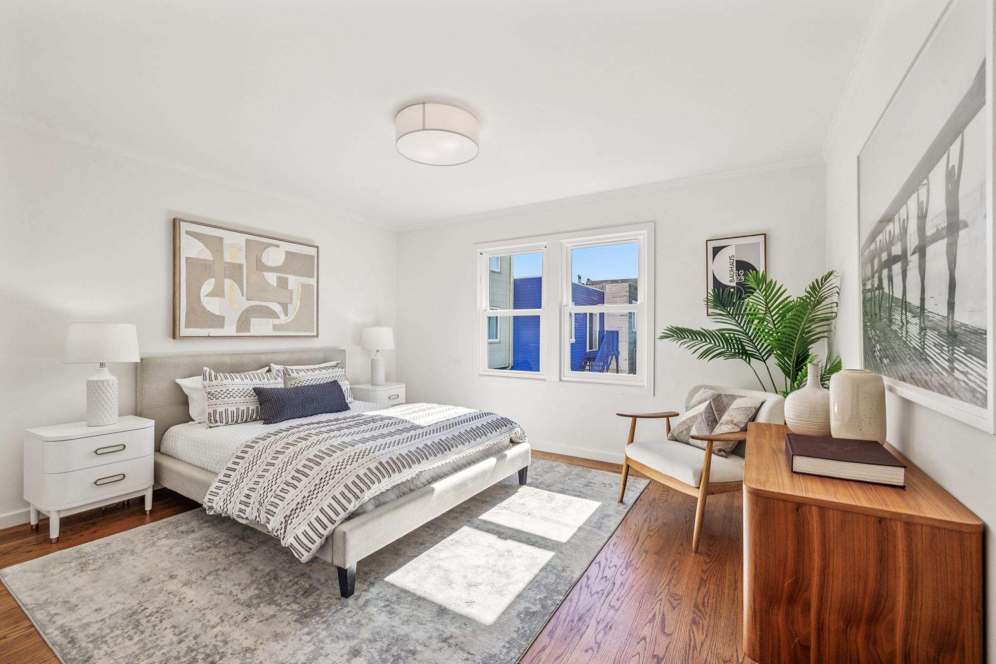 The building features 1 large unit with 3 spacious BRs and 1 BA on one level, and a lower Bonus room accessible by internal staircase offering many future options: 4th BR, primary suite or family room. Easy access to the bright South-facing garden for splendid outdoor fun. The Upper 2nd unit is light-filled with 2 BRs, 1 BA, formal living and dining rooms, spacious kitchen, ideal for income or homes for partners.